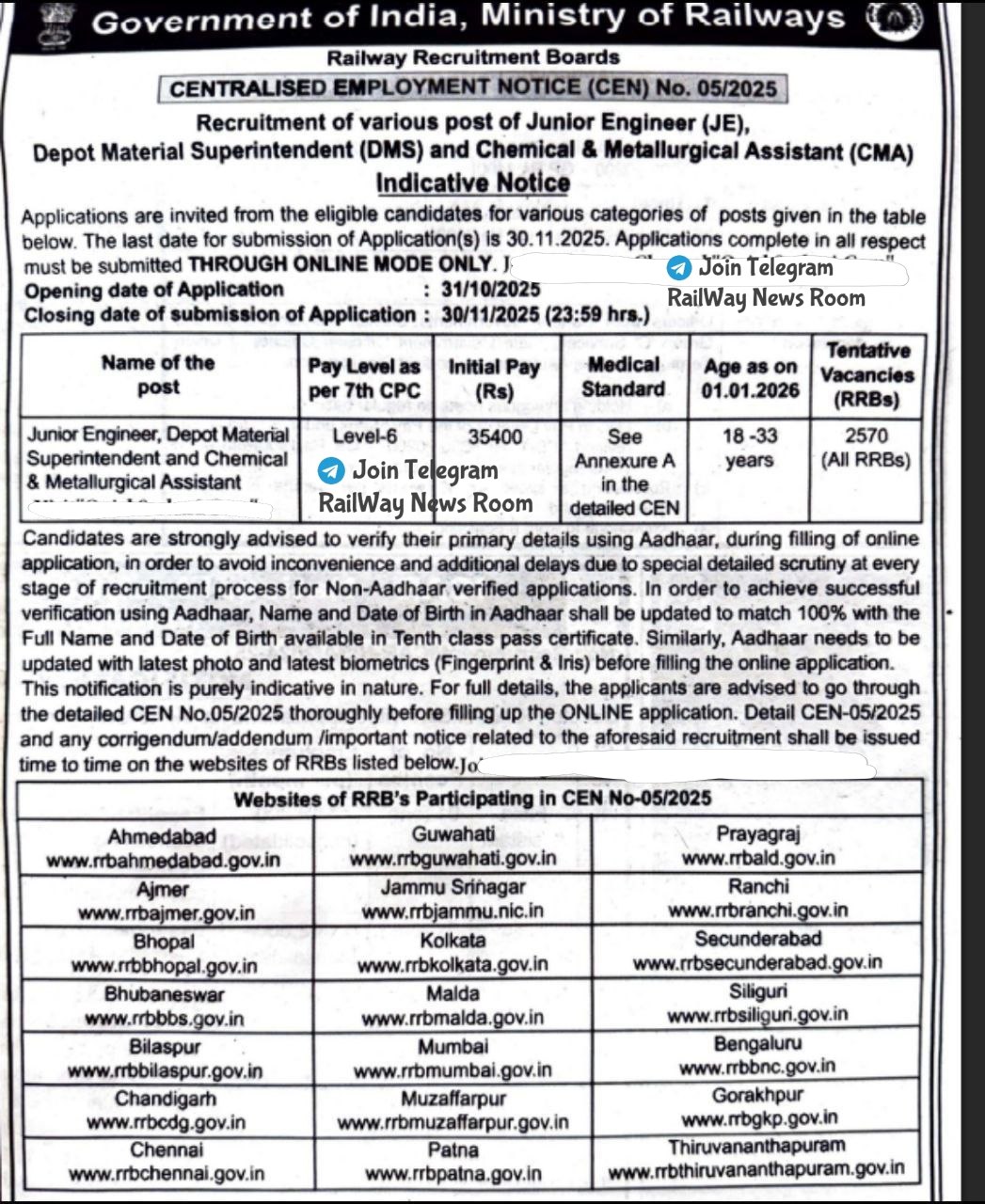 RRB JE CEN 05/2025 Recruitment | SHORT NOTICE |