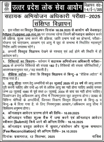 Uttar Pradesh Public Service Commission has released a short advertisement on 13th September 2025 for recruitment to 182 posts of Assistant Prosecution Officer (APO). The detailed advertisement will be released by 16th September 2025 at the official website of UPPSC, www.uppsc.up.nic.in.